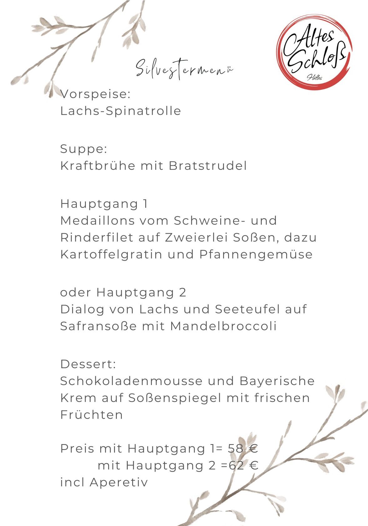 - Silvester ab 17.00 geöffnet. Silvestermenü bitte vorbestellen.